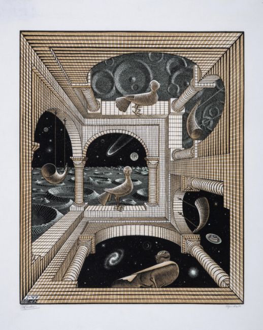 λ Maurits Cornelis Escher (1898-1972)Other World (Bool 348)Wood engraving and woodcut printed in black, reddish brown and green, 1947, a fine impression the colours fresh, signed and inscribed 'eigen druck' in pencil, printed by the artist, on tissue-thin Japan paper, with full margins, sheet 395 x 324mm (15 1/2 x 12 3/4in)Provenance: Acquired directly from the artist;thence by descent.Lot Essay:In Other World, we finds ourselves “in a strange room in which up, down, left, right, front and back can be substituted arbitrarily, depending on whether we wish to look out through one window or another” (J. L. Locher, Escher: The Complete Graphic Work, p. 144). Each side of the small room offers a view that is possible, but by linking the three different perspectives together – zenith, nadir and distance point – he has created an overall picture that is impossible. When discussing the print in a 1947 interview for the monthly periodical Phoenix, Escher explains how the print explores the possibility of viewing your surroundings like a bird. That is, the viewer may simultaneously explore from every conceivable vantage point. Each vantage point is conjured up by a window adorned with a suspended horn and the Simurgh: a mythical bird-like creature from ancient Persian art and literature. The artist owes the inspiration for the Simurgh to his father-in-law, who gave him a statuette of this enigmatic creature as a wedding gift in 1924. Like the Phoenix in Christian symbolism, it represents the eternal spirit of life, death and rebirth. Both its form and the themes it represented fascinated Escher and it features in several of his prints, such as Still Life with Spherical Mirror. Other World is one of a series of prints in which Escher toys with multiple perspectives. A few months before Escher set to work on Other World, he made the mezzotint Gallery. In January 1950, Escher wrote to his close friend, the engineer and art collector Paul Kessler: “Gallery dated XII-’46 drove me to despair; I finally completed it in April 1949. Other World is a follow-up to this, and the elongated lithograph Up and Down follows on from this one.” Other World is perhaps the most successful of the three, enticing the viewer’s eye to pore over this enchanting and mystifying moonscape ad infinitum.