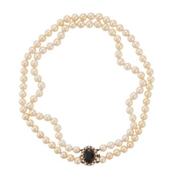 A TWO ROW CULTURED PEARL NECKLACE WITH GARNET 9CT GOLD CLASP