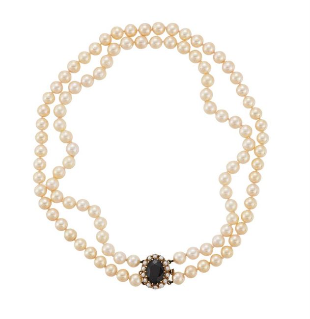 The two rows of approximately 7mm cultured pearls on a knotted strand to a garnet and cultured pearl clasp