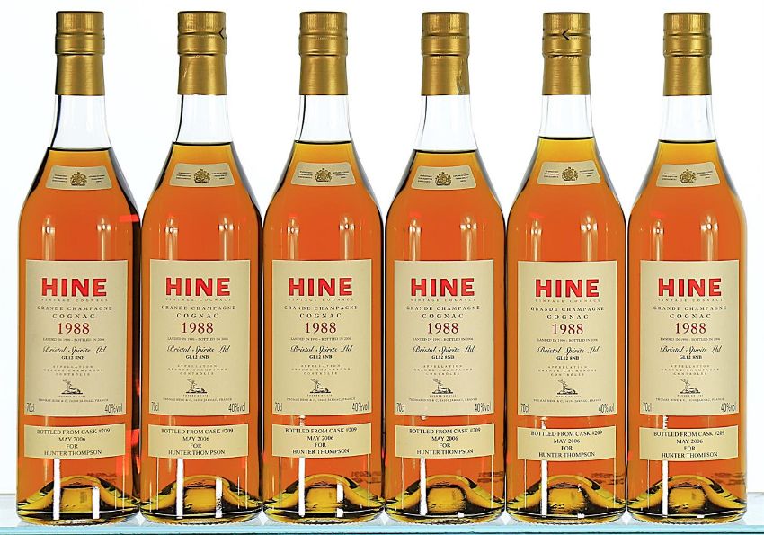 1988 Hine, Vintage Early Landed, Cognac 6x70cl Landed in 1990, bottled in 2006, private strip label states "Bottled from cask 209 May 2006 for Hunter Thompson". Acquired in cask from Bristol Spirits Ltd. in 1988, it was subsequently bottled in May 2006 under the supervision of Bernard Hine. The cases were transferred to London City Bond where they have been held ever since.