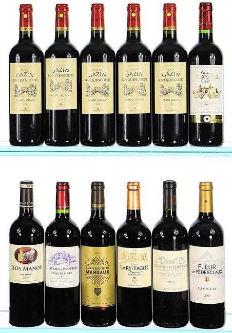 2014 Chateau Gazin Rocquencourt, Pessac-Leognan 5x75cl 2014 Fleur de Pedesclaux, Pauillac 1x75cl 2016 Chateau de Ferrand Grand Cru Classe, Saint-Emilion Grand Cru 1x75cl 2017 Clos Manou, Medoc 1x75cl 2018 Chateau de Passedieu, Cotes de Bourg 1x75cl 2019 Chateau Monconseil Gazin, Blaye-Cotes de Bordeaux 1x75cl 2020 Chateau Lary-Tagot, Bordeaux 1x75cl 2020 L'Epiphanie, Margaux 1x75clTotal 12x75cl