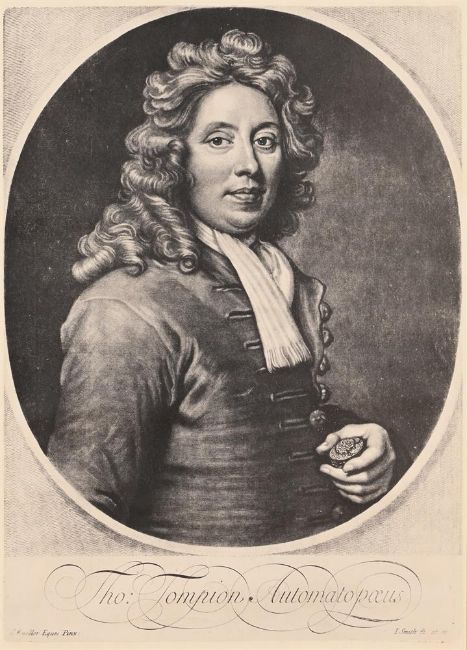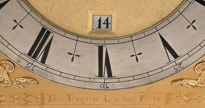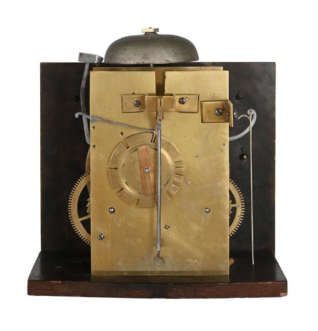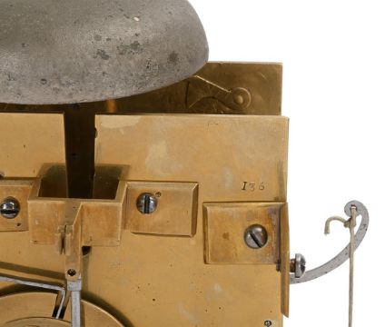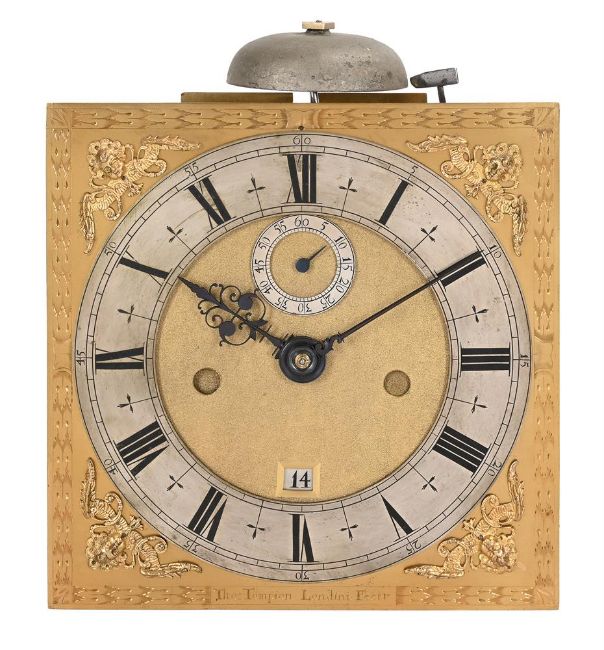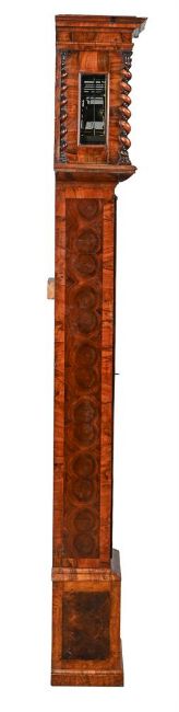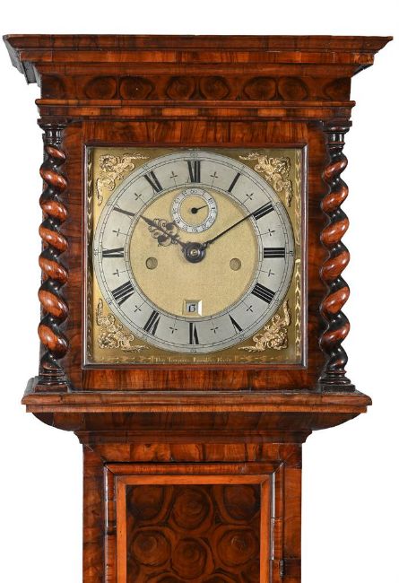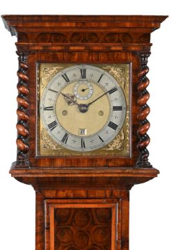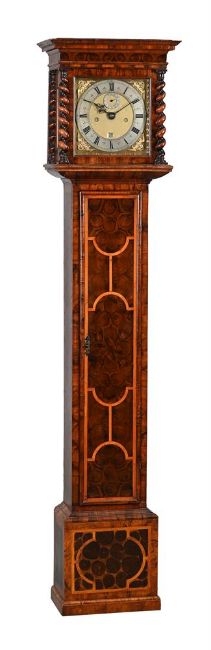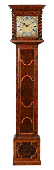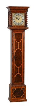 A FINE AND RARE CHARLES II OLIVEWOOD OYSTER VENEERED SMALL LONGCASE CLOCK OF ONE MONTH DURATION THOMAS TOMPION, LONDON, NO. 136 CIRCA 1688/89The substantial six finned and latched pillar movement with five-wheel trains and plates measuring 8 by 5.5 inches, the going train with bolt-and-shutter maintaining power and anchor escapement regulated by seconds pendulum with long crutch, the strike train with external countwheel set on a pivot-post driven by a pinion-of-report applied to the second wheel arbor and sounding the hours on a bell mounted above the plates, the 'type 1' latched 10.25 inch square gilt brass dial with shuttered winding holes, subsidiary seconds dial and calendar aperture to the finely matted centre within applied silvered Roman numeral chapter ring with cruciform half hour markers and small Arabic five minutes beyond the outer minute track, with sculpted scroll pierced steel hands and applied winged cherub mask spandrels to angles within a 'double herringbone' engraved outer interrupted by the engraved signature Tho: Tompion Londini Fecit to lower margin, in an oyster olive wood veneered case with rising hood incorporating architectural ogee moulded cornice and oyster veneered frieze over glazed dial aperture flanked opposing Solomonic twist columns, the sides with rectangular windows and conforming quarter columns set against bargeboards at the rear, the trunk with convex throat moulding over 40 inch rectangular door veneered with three linked boxwood outlined architectural break-arch panels populated by oyster cut veneers incorporating geometric radial design to the central panel, with half-round cross grain edge mouldings and crossbanded surround, the sides veneered with repeating oysters with a conforming crossbanded border, the base with stepped ogee top moulding over conforming architectural panel veneered crossbanded front and moulded skirt.186.5cm (73.5ins) high, 43cm (17ins) wide, 25cm (9.75ins) deep. Provenance:The Leonard Fuller Collection, purchased from G.H. Bell, Winchester, 6th September 1966 for £6,170. Purchased by G.H. Bell from Sotheby's, London, sale of FINE ENGLISH AND CONTINENTAL FURNITURE, RUGS AND CARPETS, TAPESTRIES AND CLOCKS 21st May 1965 (Lot 55) 'The Property of a Gentleman' for £1,600 hammer. Thomas Tompion has often been referred to as the 'father of English clock and watchmaking'. When considering the legacy of his work and influence on subsequent generations, such a compliment is justly deserved. Born in Ickwell, Suffolk in 1639 Thomas Tompion appears to have developed an affinity for metalworking from his father, also named Thomas, who worked as a blacksmith. By 1670 Tompion had moved to London and was working in the clock and watchmaking trade. Although there is no record of his apprenticeship or whether he received any formal training prior to moving to London, he quickly became established and obtained his freedom of the Clockmaker's Company in late 1671. His early clocks demonstrate a close working relationship with the Fromanteel, East and Knibb workshops. Around this time Tompion became friendly with eminent mathematicians and scientists such as Robert Hooke and Jonas Moore - perhaps the most progressive and inventive minds of the day. Such associations lead to Royal commissions, firstly from Charles II for whom Tompion is known to have made one of the earliest balance-spring watches in 1676 and later William III who ordered numerous clocks to furnish his various palaces throughout his reign. As well as being an extremely talented artisan Tompion was also commercially minded, cleverly introducing serial numbering for his watches and clocks from around 1681/2. This, as well as maintaining a high degree of refinement in both the design and construction of his clocks and watches, ensured the highest level of exclusivity for clients purchasing from him. In around 1701 Thomas Tompion took a former apprentice, Edward Banger, into partnership. Banger was originally apprenticed to Thomas Ashby in 1687 but was transferred over to Tompion and gained his freedom of the Clockmaker's Company in 1695. He was clearly a talented maker (when considering the few examples signed by Banger alone) however a serious problem between him and his former master caused the partnership to come to an abrupt end in 1707-8 for reasons unknown. On Banger's departure Tompion reverted to working alone until he found confidence in George Graham who had been engaged as a journeyman for Tompion since 1696. Graham's character had already been given the seal of approval by Tompion who allowed him to marry his niece, Elizabeth, in 1704; however it still would be a few years before Tompion would take Graham into partnership which he eventually did in 1711.Thomas Tompion died in November 1713 leaving the business to George Graham who maintained the same exacting standards and became famous in his own right with notable achievements including the development of the deadbeat escapement for pendulum clocks and the cylinder escapement for watches. Edward Banger outlived Tompion by six years, his abilities as a highly skilled watchmaker are demonstrated within a fine jewelled movement dating to around 1715 by him illustrated by him in Evans, Jeremy THOMAS TOMPION at the Dial and Three Crowns page 54, Fig. 97. The movement and dial of the present lot conform to the 'type 1' phase of Tompion longcase clock development as set-out in Evans, Jeremy; Carter, Jonathan and Wright, Ben THOMAS TOMPION, 300 YEARS pages 197-217. The dial is indeed a 'textbook' example of its type and can be directly compared to that of another month longcase (number 14) with double wheat-ear border by Tompion, illustrated in Symonds, R.W. THOMAS TOMPION on page 78 (Figure 54). The movement conforms to Tompion's standard layout for a month duration longcase clock with another of near identical design (number 223) illustrated by Evans, Carter and Wright on page 204. Indeed, the only real variances betw