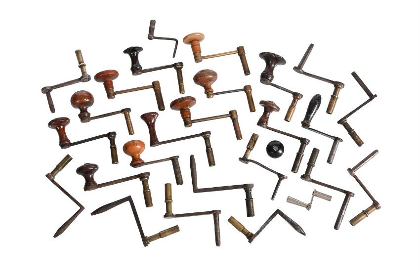 A GROUP OF TWENTY-SIX CLOCK CRANK WINDING KEYSANONYMOUS, EARLY 18th CENTURY AND LATERComprising nine early 18th to mid 19th century with wooden-handles, five twentieth century also with wooden handles, and twelve steel handled.