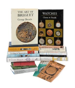 Ɵ HOROLOGICAL REFERENCE BOOKS RELATING TO WATCHESFIFTEEN VOLUMES:Daniels, George The Art of Breguet Sotheby Parke Bernet, London and New York 1974, dj; Clutton, Cecil and Daniels, George WATCHES B.T, Batsford Limited, London 1965, dj; Clutton, Cecil and Daniels, George WATCHES enlarged edition Sotheby Parke Bernet, London and New York 1975, dj; Camerer Cuss, Terence THE ENGLISH WATCH 1585-1970 Antique Collectors' Club, Woodbridge 2009, dj; Camerer Cuss, T.P. The Camerer Cuss Book of ANTIQUE WATCHES Antique Collectors' Club, Woodbridge 1976, dj; Daniels, George WATCHMAKING Sotheby Publications London 1981, dj; Kemp, Robert The Englishman's Watch John Sherratt and Son Limited, London 1979, dj; Thompson, David Watches The British Museum Press, London 2008, dj; Clutton, Cecil Collector's Collection The Antiquarian Horological Society, London 1974, dj; Daniels, George English & American Watches Abelard-Schuman, London, New York and Toronto 1967, dj; Camerer Cuss, T.P. The Country Life Book of WATCHES Country Life Limited, London 1967, dj; Cutmore, M. The Watch Collector's Handbook David and Charles, Newton Abbot 1976, dj; Ullyett, Kenneth Watch Collecting Frederick Muller, London 1970, dj; Hayward, J.F. VICTORIA AND ALBERT MUSEUM, ENGLISH WATCHES Her Majesty's Stationery Office, London 1969, softbound; Anon SMITH & SONS LTD. Guide to The Purchase of a WATCH, With Illustrations facsimile reprint of the circa 1892 trade catalogue, Malcolm Gardner, Sevenoaks 1969, gilt titled blue cloth; together with copies of Gould, Rupert T. THE MARINE CHRONOMETER, IT'S HISTORY AND DEVELOPMENT Antique Collectors' Club, Woodbridge 1989, dj; Britten, F.J. The Antique Collectors' Club edition of OLD CLOCKS AND WATCHES AND THEIR MAKERS Antique Collectors' Club, Woodbridge 1977, dj, and two related sundry publications, (19). Provenance:The Leonard Fuller Collection.