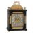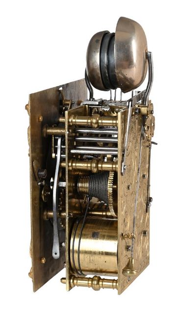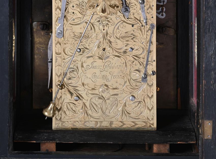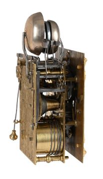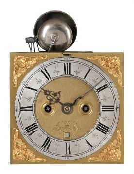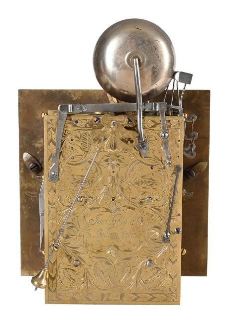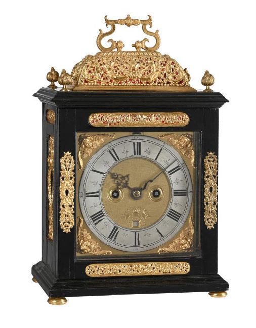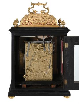 AN INTERESTING WILLIAM III GRANDE-SONNERIE STRIKING AND REPEATING EBONISED 'BASKET TOP' TABLE CLOCK ISAAC GODDARD, LONDON, CIRCA 1695The six finned and latched pillar twin fusee bell striking movement with verge escapement regulated by short bob pendulum with knife-edge suspension, two-in one grande-sonnerie striking peeling the quarters on a graduated nest of three bells and sounding the hour on a further larger bell, and pull-quarter repeat operating on the same mechanism, the backplate engraved with symmetrical scrolling foliage including tulip blooms within a herringbone border around a central leafy cartouche signed Isaac Goddard, Londini, fecit, the upper right hand corner also incorporating steel lever for strike selection with three numbered positions, the 7.5 inch square brass dial with ringed winding holes and 'triple crown' border engraved calendar aperture to the matted centre within applied silvered Roman numeral chapter ring with stylised sword hilt half hour markers and small Arabic five minutes beyond the outer minute ring, with sculpted scroll-pierced steel hands, applied gilt winged cherub mask spandrels to angles and with S/N strike/silent selection switch at twelve o'clock, the case with Quare-type hinged foliate bud tied scroll-shaped carrying handle over pierced brass repousse 'basket' superstructure decorated with scrollwork inhabited by basket of flowers flanked by cornucopiae and cherubs to front and rear and pair of cherubs alone to each side, above rope twist and cast ogee moulded lower border, flanked by brass flambeau finials, with double-ogee top mouldings over hinged glazed front applied with foliate repousse mounts to the frame of the door incorporating a stretched lozenge sound fret to upper rail, the sides with conforming gilt lozenge frets over rectangular glazed apertures each overlaid with a relief foliate scroll decorated repousse panel incorporating laurel-bordered oval aperture to centre, the rear with glazed door set within the frame of the case, on conforming complex ogee moulded skirt base with gilt brass disc feet.38cm (15ins) high with handle down, 27.5cm (10.75ins) wide, 18cm (7ins) deep. Isaac Goddard is recorded in Loomes, Brian Clockmakers of Britain 1286-1700 as born circa 1661, apprenticed in 1675 to Thomas Grimes (through Samual Davis) and gaining his freedom of the Clockmakers' Company in 1684. He was married at St, Dunstan's in 1691 and is thought to have worked for the Stanton family of Clockmakers. Isaac Goddard signed the clockmakers oath of allegiance in 1697 and is thought to have worked in Holborn; Loomes further notes that he is not heard of after 1699. The engraved 'triple crown' decoration around the calendar aperture of the current lot is a feature sometimes seen on longcase clocks dating from the 1690's and is generally thought to represent the unification of the three Kingdoms of England, Ireland and Scotland, which was first envisaged during the reign of James II in 1688 and was cemented by Act of Parliament in 1707. Indeed, it is possible that this decoration commemorates the signing of the clockmaker's oath of allegiance (to the crown) in 1697. The engraving to the backplate of the present timepiece can be also compared to decoration discussed in Dzik, Sunny ENGRAVING ON ENGLISH TABLE CLOCKS, Art on a Canvas of Brass within the chapter titled A CLOSER LOOK AT TULIP ENGRAVING pages 143-46. Indeed two backplates of closely related design (for clocks by William Speakman and Thomas Power) to that of the present lot are illustrated on page 145 (Figure 8.16). The grande-sonnerie striking system within the present clock is a very unusual detail which utilises the fact that the pull-repeat system is powered directly by the fusee strike train rather than being driven by a supplementary spring barrel (or blade spring). In order to achieve this, the movement is fitted with a wheel within the motionwork applied with pins corresponding to each quarter, with the one at the half hour being slightly longer (than the first and third quarters), and the hour longer again. This wheel is set on a pump arbor with three positions governed by the lever on the backplate. The first pulls the pins clear of the repeat trip lever except for the hour, the hence clock only sounds the hours on the hour; the second moves the half hour into play, hence the clock sounds the hours along with its quarter at the half hour also; the third position provides full grande-sonnerie striking. The underlying quarter-repeat system which allows this unusual striking system to be incorporated is devised with the quarter peel and hour hammer pins applied applied to the same pin barrel. When activated (tripped) the hammer assembly is first positioned to engage with the pins for the quarters, before the whole hammer block assembly is automatically shunted along in order for the offset hour hammer pin to operate the hour hammer. In addition to this, both the quarter and hour racks are neatly positioned one behind the other in order for the same gathering pallet to be used for both, with the hour rack hook lifted out of the way whilst the quarters are sounding. Two clocks (by Charles Gretton and John Adamson respectively) with closely related repeat systems to the present lot are described and illustrated in Dzik, Sunny BENEATH THE DIAL, English Clock Pull Repeat Striking 1675-1725 pages 486-89.Naturally, as the entire striking system is powered by a single fusee train, the duration for which the 'grande-sonnerie' can be used between windings is limited. Indeed, with the third position set on the backplate (for full grande-sonnerie striking) the strike train will need to be wound approximately every two-and-a-half days. Condition Report: PLEASE CONTACT DEPARTMENT FOR CONDOTION REPORT. Condition Report Disclaimer