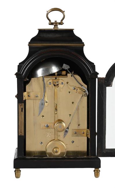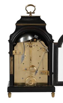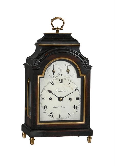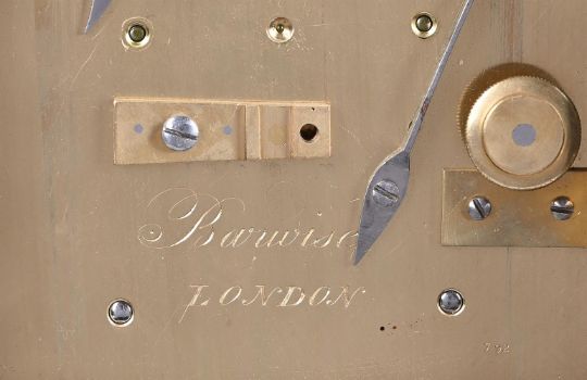 A FINE REGENCY MINIATURE BRASS MOUNTED EBONISED TABLE/BRACKET CLOCK WITH TRIP-HOUR REPEATBARWISE, LONDON, CIRCA 1820The five columnar pillar twin chain fusee bell striking movement with anchor escapement regulated by disc-bob pendulum incorporating transverse pivoted beam rise/fall regulation to suspension and holdfast to the shouldered backplate, engraved Barwise, LONDON to centre, the 4 inch single sheet silvered brass Roman numeral break-arch dial also signed Barwise, LONDON to the centre, with blued steel spade hands beneath arch incorporating twin subsidiary STRIKE/SILENT and regulation dials, the case with hinged sculpted brass handle and rectangular plate capping the ogee shaped caddy superstructure over moulded brass collar and further outswept concave section merging with the break-arch profile top applied with the complex cornice mouldings, the opening front with brass fillet mouldings bordering the glazed dial aperture, the sides with conforming brass-edged arched windows and the rear matching the front, on cushion moulded skirt base and turned brass acorn-shaped feet.27.5cm (10.75ins) high with handle down, 15cm (6ins) wide, 11cm (4.25ins) deep. The life of John Barwise and his family are outlined by A.D. Stewart in his article Barwise & Sons: Watchmakers to the King, A brief history of family and firm published in the March 2014 issue of 'ANTIQUARIAN HOROLOGY' (Vol IIIV No. 1 pages 621-34). Stewart notes that John Barwise was born into a clockmaking family in Cockermouth, Cumberland in around 1756. By 1780 he had moved to London where he opened a watch retailing business. Ten years later he married Elizabeth Weston with his address being recorded as 29 St. Martin's Lane where he remained until his death in 1820. Of their eleven children two (possibly three) died in infancy and two, John II (born 1795) and Weston (born 1793), subsequently joined their father in the family business. In 1800, such was his success, John Barwise I purchased a second house in Dulwich.In 1805 John Barwise I was one of the fifteen watchmakers appointed by The Board of Longitude to adjudicate in the dispute between John Arnold and Thomas Earnshaw regarding 'the respective merits of their chronometers'. On the 14th February 1811 Barwise was the victim of five highwayman who relieved him of a 'gold watch, greatcoat, and a guinea-and-a-half in cash' whilst en-route from Camberwell to Dulwich. This unfortunate occurrence may well have tempered Barwise's enthusiasm for his house in Dulwich as records indicate it was rented out to tenants by 1813. In around 1816 his sons, John II (who had just turned 21) and Weston, joined him in partnership with the business then becoming 'Barwise & Sons'. Shortly afterwards (probably in 1820) the firm obtained the Royal Warrant as watchmakers to King George IV.John Barwise senior died in 1820; by this time he was a wealthy man leaving two properties and substantial investments to his widow and children. The business was continued by Weston and John II in partnership, however this only lasted six years as Weston died in 1826 leaving the business in the hands of John II alone. It was at this time that John II married and moved from the family home at St. Martin's Lane to nearby 42 Craven Street; and then in 1840 to a spacious residence called East Lodge, near Acton which at that time was in open countryside. At around the same time John Barwise II entered into an alliance with the highly inventive Scottish Clockmaker Alexander Bain who was in the process of developing the first electric timepiece. Barwise and Bain subsequently filed a patent (No. 8743) for an 'Electro-Magnetic Clock' which was granted in January 1841; an example of which was then subsequently exhibited at the Royal Polytechnic Institution shortly afterwards.In 1842 John Barwise II was approached by Pierre Frederic Ingold (1787-1878) to assist in the creation of a watch factory which, by employing newly invented machinery, would be able to mass produce high quality watches at a much smaller cost than the prevalent hand-built movements available at the time. Barwise, along with Thomas Earnshaw junior, subsequently became managing directors of the newly established 'British Watch and Clockmaking Company'. Unfortunately the venture failed, and Barwise was declared bankrupt in 1846. With this he lost his house, East Lodge near Acton, but still managed to keep the business afloat. After a few more years of struggling in the business John Barwise II retired leaving it in the hands of the Swiss watchmaker, Jules Rochat, who joined the firm in 1847. John Barwise II was recorded in the 1861 census as being a 'chronometer maker out of business' and presumably still resided at 7 Queen's Row, Camberwell until his death in 1869. The present timepiece is finely made and finished and of very pleasing small proportions with the design of the case following that of a series of miniature timepieces produced by Grimalde and Johnson, London. The movement of the current clock, however, is of much higher specification than those mostly seen by Grimalde and Johnson, which are generally only single fusee timepieces. Condition Report: Movement is in fine relatively clean working condition and appears very original with no visible evidence of alteration or notable replacements. If intending to put into long-term service however a precautionary gentle clean/lubrication is advised. The dial is in sound original condition, it is presentable with nice overall slightly mellow colouring but has some spots of oxidation and slight rubbing around the winding holes so may benefit from being re-silvered (depending on personal preference). The case is also in fine original condition with the only notable faults being that the putty holding in the front door glass is starting to come loose and drop out. The baseboard of the case is cut with a slot to allow for the pendulum swing - this is an original feature. Faults to the case are otherwise v