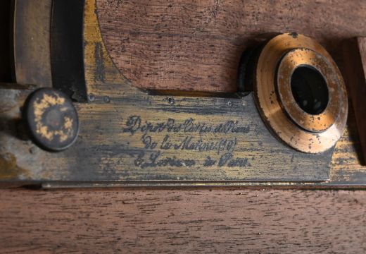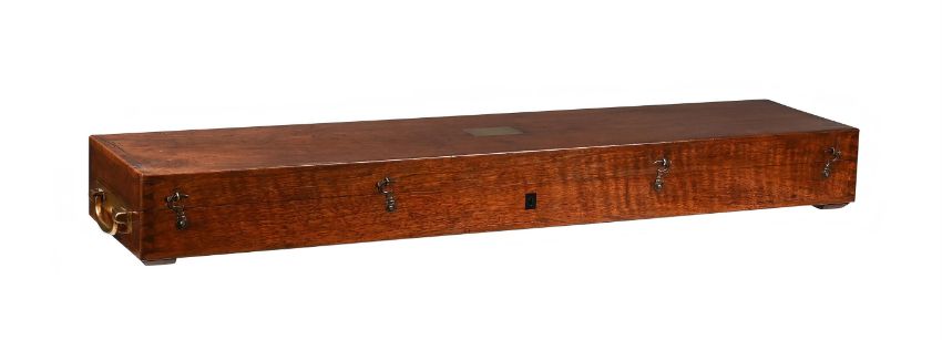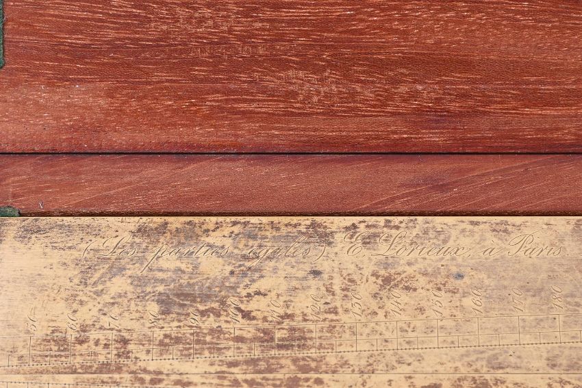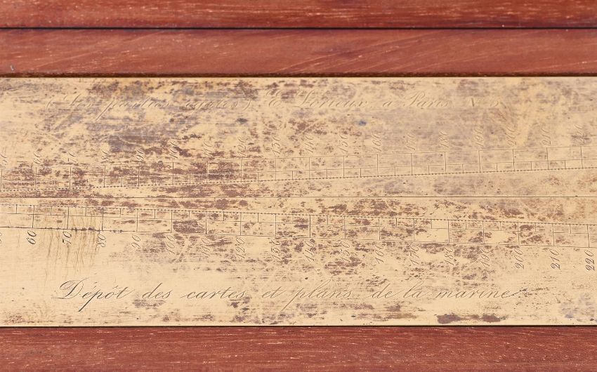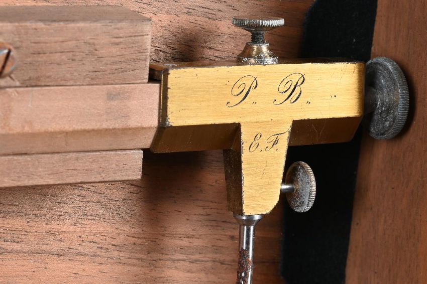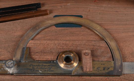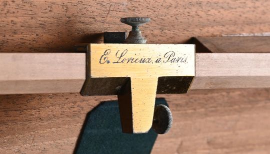 Y A FRENCH WALNUT-CASED PART SET OF NAVAL ARCHITECT OR CARTOGRAPHERS DRAWING INSTRUMENTSE. LORIEUX, PARIS, MID 19th CENTURYComprising a heavy 16.5 inch hinged brass sector engraved with two opposing angled scales each marked for single units annotated in tens 10-600, the left upper margin inscribed (Les parties egales) and signed E. Lorieux, A Paris, No. 5 and the lower inscribed Depot des cartes et plans de la marine, the right-hand side engraved with initials E.F. over N. 5 and P.B., contained in a hinged polished mahogany case; a brass and steel draughtsman's protractor with radius divided for degrees and annotated in tens in both directions, with hinged arm pivoted at the centre incorporating Vernier scale and also engraved Depot des Cartes et Plans, de la Marine (10), E. Lorieux, A Paris and initialled P.B, E.F., both the arm and the base of the arc fitted with steel extension rules; two compass radius arms, the first with 42 inch boxwood beam fitted with steel sharp point set in a T-shaped mount engraved Depot de la Marine, 22 and P.B. over E.F. to verso, opposing a conforming sliding mount fitted with a loop for a pencil and engraved E. Lorieux a Paris, the second of similar design but smaller with 23.75 inch steel beam and signed ...Hurlimann a Paris over initials E.F. to mount; four ebony square-section straight edges; three various boxwood rulers; two steel rulers; and a boxwood set square, all contained in a solid walnut box inset with brass plate engraved E. Fichol to lid and with substantial hinged cast brass carrying handles to each end.The box 120cm (47.25ins) long including handles, 13cm (5ins) high, 26cm (10.25ins) deep. The firm Lorieux was one of the most important Parisien manufacturers of sextants and other maritime instruments during the second half of the 19th century. The business was established in 1845 by two pupils of the renowned instrument maker Henri Gambey; in around 1902 the firm moved from 43, Passage Dauphine, Paris, to 6 rue Victor Considerant. It was then taken over by Albert Lepetit, in about 1914, and moved to Montrouge at 204 avenue Marx Dormoy, before passing into the hands of Roger Poulin in around 1950.