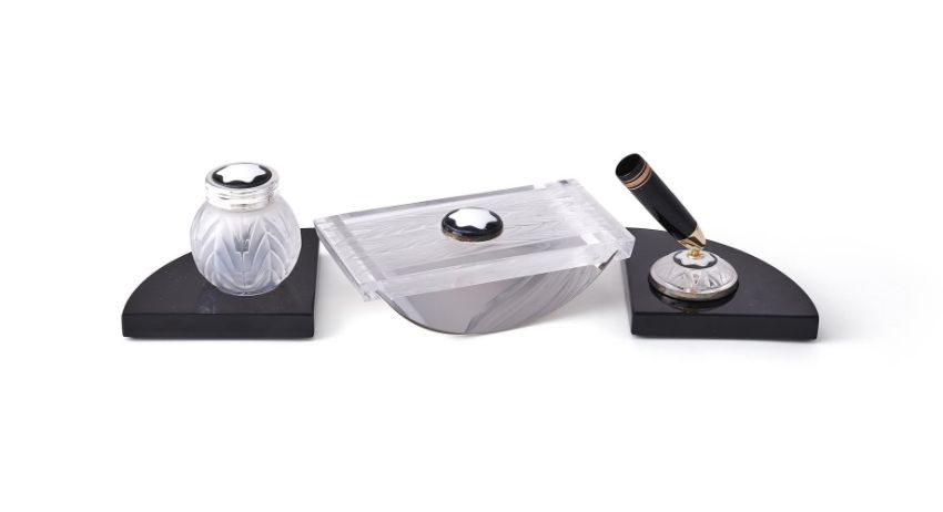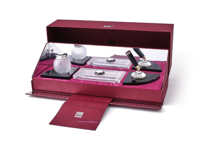 MONTBLANC, CREATION LALIQUE, SET DE BUREAU A LIMITED EDITION DESK SET, NO. 2746/4810, 1991 With blotter, inkwell and pen holder, each etched Création Lalique France 2463/4810 Accessories: Original Montblanc Creation Lalique box, Certificate Of Authenticity, International Service Certificate and outer card boxProvenance: A Single Owner Collection of Fine and Limited Edition Montblanc Pens and Accessories