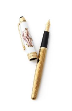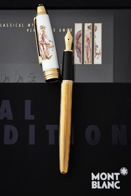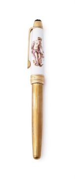 MONTBLANC, ANNUAL EDITION, CLASSICAL MYTH, VENUS AND AMOUR A LIMITED EDITION OF 300 FOUNTAIN PEN, 2005 Cap and Barrel: Meissen porcelain cap depicting the Venus and Amour, with gilt clip and barrel Nib and Filling System: Medium yellow gold coloured nib stamped 18K and 750, cartridge filling system with cartridge converter, uninked Accessories: Original Montblanc Annual Edition 2005 box, Classical Myth Venus and Amour booklet, Annual Edition 2005 outer card box and outer white card boxProvenance: A Single Owner Collection of Fine and Limited Edition Montblanc Pens and Accessories Condition Report: Delivered to Dreweatts sealed and unopened. Opened by Dreweatts for inspection only. Pen is mint and unused. Packaging is mint.Condition Report Disclaimer