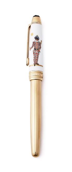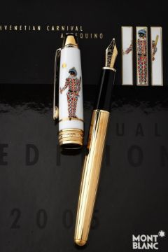 MONTBLANC, ANNUAL EDITION, VENETIAN CARNIVAL, ARLEQUINO A LIMITED EDITION OF 300 FOUNTAIN PEN, 2005 Cap and Barrel: Meissen porcelain cap depicting Arlequino from the Commedia dell'Arte, with gilt clip and barrel Nib and Filling System: Medium yellow gold coloured nib stamped 18K and 750, cartridge filling system with cartridge converter, uninked Accessories: Original Montblanc Annual Edition 2005 box, Venetian Carnival Arlequino booklet, Annual Edition 2005 outer card box and outer white card boxProvenance: A Single Owner Collection of Fine and Limited Edition Montblanc Pens and Accessories Condition Report: Delivered to Dreweatts sealed and unopened. Opened by Dreweatts for inspection only. Pen is mint and unused. Packaging is mint.Condition Report Disclaimer