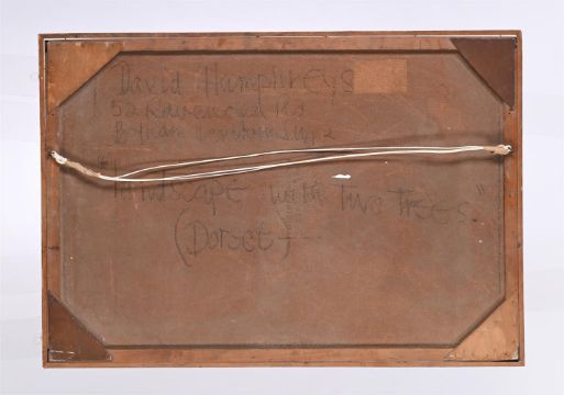 DAVID HUMPHREYS (BRITISH B. 1937) LANDSCAPE WITH TWO TREES (DORSET) Oil on board Signed, titled and inscribed (verso) 61 x 87cm (24 x 34¼ in.)Provenance: Direct from Angela Conner's studio collection Please note measurements do not include the frame unless otherwise stated.  Please note Dreweatts are not liable for damage to frames or mounts. Condition Report: Surface dirt throughout. A number of surface scratches the most notable approx. 30cm running diagonally from the centre towards the upper right corner. Scattered areas of flaking and loss most notable to the centre of the work. Condition Report Disclaimer