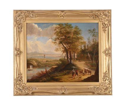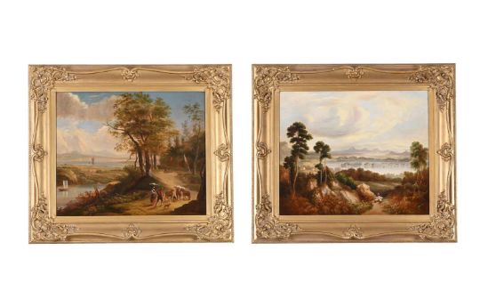 CIRCLE OF HENRY GIBSON DUGUID (SCOTTISH FL. 1831 - 1860) CATTLE DROVING; SHEEP HERDING Oil on canvas 51 x 60cm (20 x 23½ in.) (2)Measurements do not include the frame unless specified. Condition Report: Both canvases have been lined. Craquelure and stretcher marks visible. Some light surface dirt throughout and rubbing and abrasions along the framing edges. The Sheep Herding canvas with a small patch (verso) which corresponds with some old repair (recto). Inspection under UV reveals scattered retouching to Sheep Herding throughout. Cattle Droving with some very minimal scattered spots of overpaint to the left edge, otherwise there is no evidence of restoration or repair. Please note Dreweatts is not responsible for damage to frames.Condition Report Disclaimer