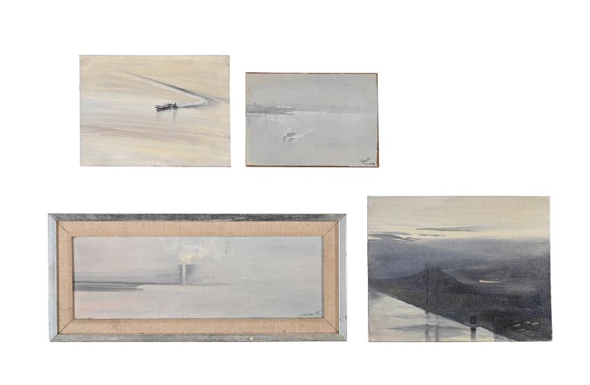 ANGELA CONNER (BRITISH B. 1935) FOUR VIEWS OF THE EAST RIVER Oil on canvas laid to board Variously signed, inscribed and dated Various sizes, the largest 14 x 36cm (5½ x 14 in.) Three unframed, one framed (4)Provenance: Direct from the artist's studio collection Please note measurements do not include the frame unless otherwise stated.  Please note Dreweatts are not liable for damage to frames or mounts. Condition Report: In studio condition. Light surface dirt throughout. May benefit from a light clean. One on artist's prepared board. One small oil on canvas laid to board, the edges are frayed and coming away slightly from the board. Condition Report Disclaimer