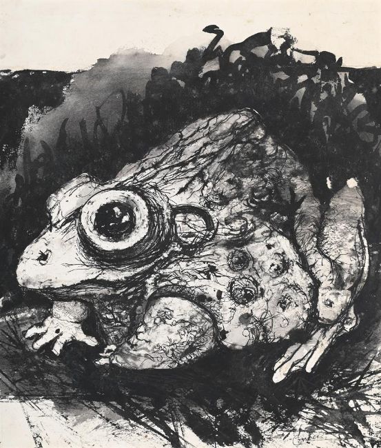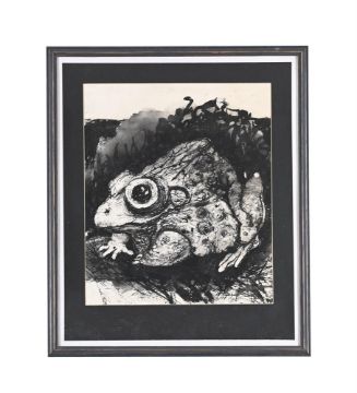 ANGELA CONNER (BRITISH B. 1935) FROG Ink, watercolour and wash Signed (lower right) 44 x 38cm (17¼ x 14¾ in.)Provenance: Direct from the artist's studio collection Please note measurements do not include the frame unless otherwise stated.  Please note Dreweatts are not liable for damage to frames or mounts.