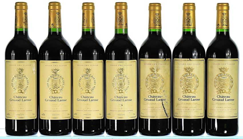 1993 Chateau Gruaud Larose 2eme Cru Classe, Saint-Julien 3x75cl 2003 Chateau Gruaud Larose 2eme Cru Classe, Saint-Julien 4x75clTotal 7x75cl Labels soiled and scuffed, 1 damaged. Previously stored in a private temperature controlled cellar.