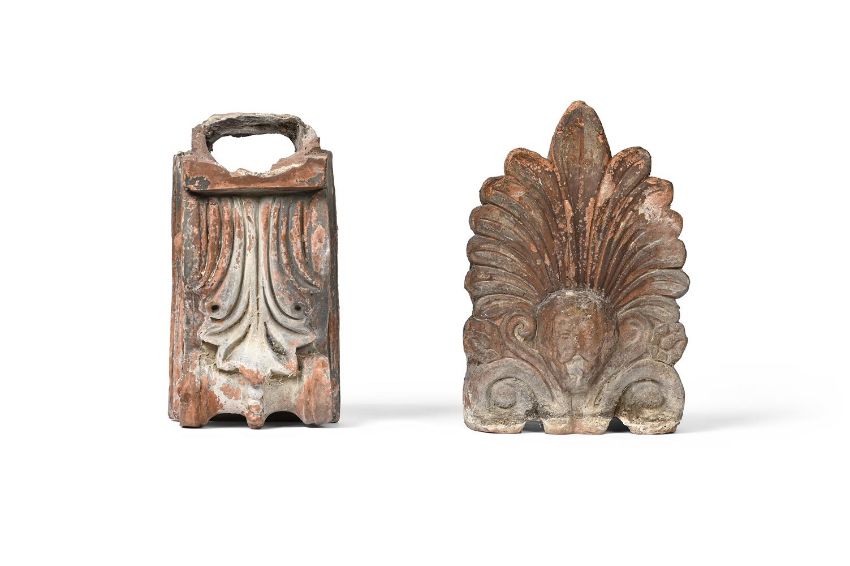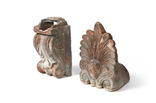 Probably architectural decorative fragments, one probably a ridge-tile with acanthus and male mask, 26.5cm high, the other a corbel, 25cm high overall