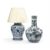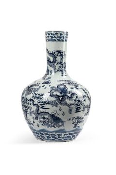 A BLUE AND WHITE PORCELAIN VASE TABLE LAMP OF RECENT MANUFACTURE With a pleated silk shade 70cm high to top of fittings, overall 77cm high, 51cm diameterTOGETHER WITH A BLUE AND WHITE BOTTLE VASE 60cm high, 39cm diameter