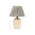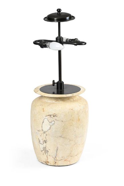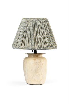 A STONEWARE VASE TABLE LAMP OF RECENT MANUFACTURE With a pale blue geometric printed muslin pleated shade 65cm high to the fittings, 24cm diameter, overall 66cm high, 49cm diameter