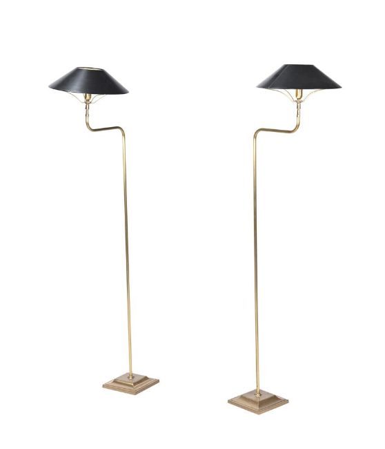 A PAIR OF BRASS FLOOR STANDING READING LAMPS OF RECENT MANUFACTURE 151cm high, 34cm wide, 49cm deep