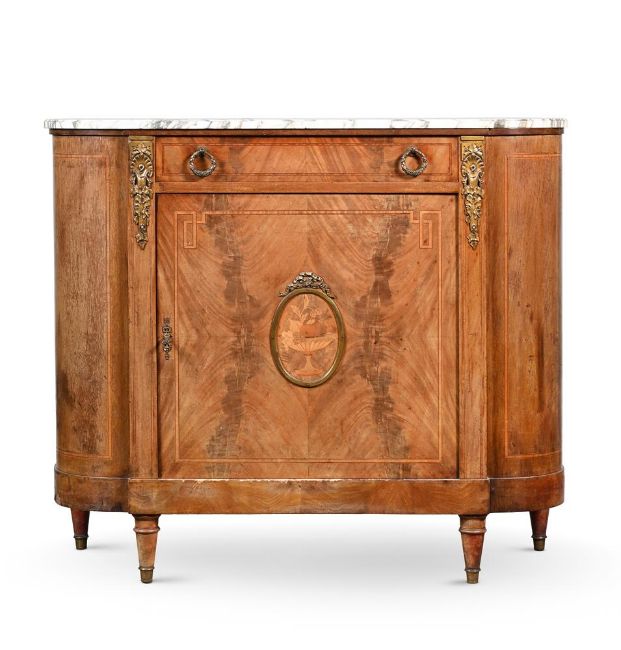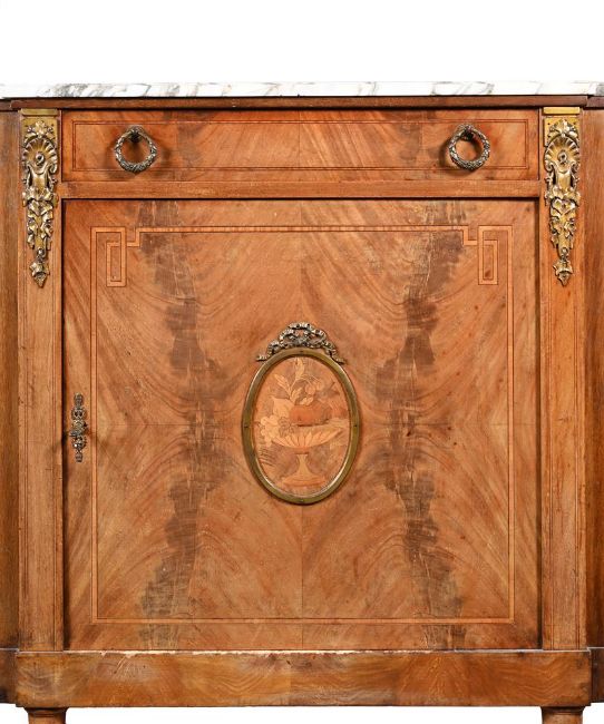 A FRENCH MAHOGANY, MARQUETRY AND MARBLE SIDE CABINET 19TH CENTURY The drawer enclosing a shelf 101cm high, 116cm wide, 46cm deep