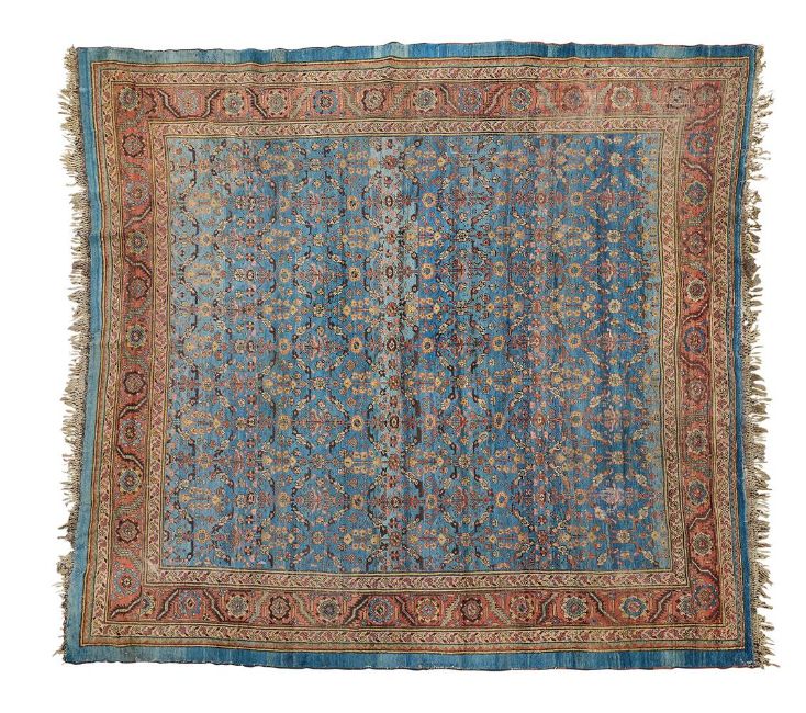 A LARGE BLUE GROUND CARPET, POSSIBLY A TURKISH USHAK Approximately 350 x 320cm Saleroom Notice: Please note, this carpet appears to have been reduced in length ('cut and shut'). There is a stitched join line/cut across the centre. Condition Report: Please note, this carpet appears to have been reduced in length ('cut and shut'). There is a stitched join line/cut across the centre. Carpet with significant wear overall consistent with age and use. Wear reveals underlying weft and knot heads in areas throughout. Various losses and areas short pile throughout. Tasselled ends with significant wear, fraying and losses. Longest edges have been rebound but are untidy. They have wear, various losses, fraying and undulation. They have been bound in varying colours of thread. Surface dirt, could benefit from cleaning. Various old stitched repairs and some areas of pile re-woven (see images for details). Some stitched join lines visible to front of carpet (see images). Some losses to pile in places which appear to be from old moth damage - see images. Some variation and 'abrash' to colours of carpet. Please refer to additional images for visual reference to condition.  Condition Report Disclaimer