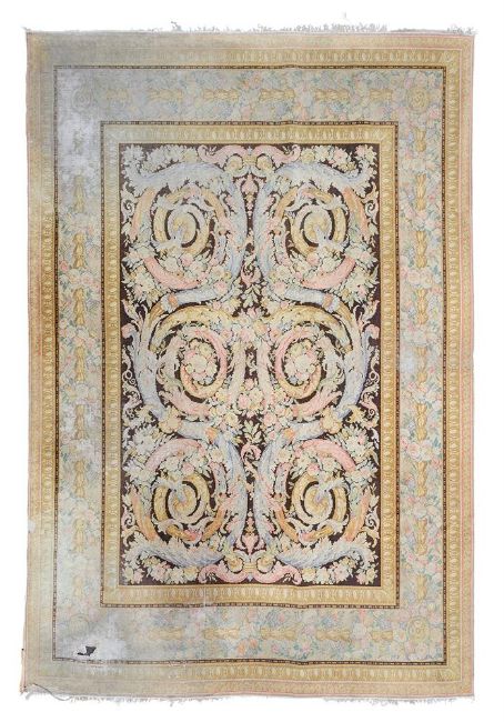 A TUFTED WOOL CARPET IN SAVONNERIE STYLE 20TH CENTURY The brown field with rinceaux, within a floral swag border Approximately 445cm long, 294cm wide  Illustrated: The Connoisseur, May 1965, p.4