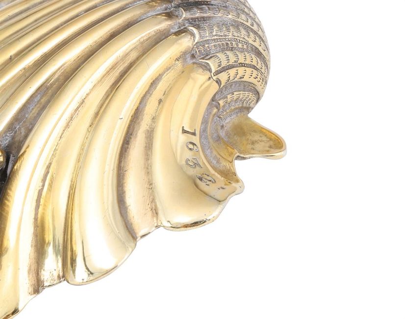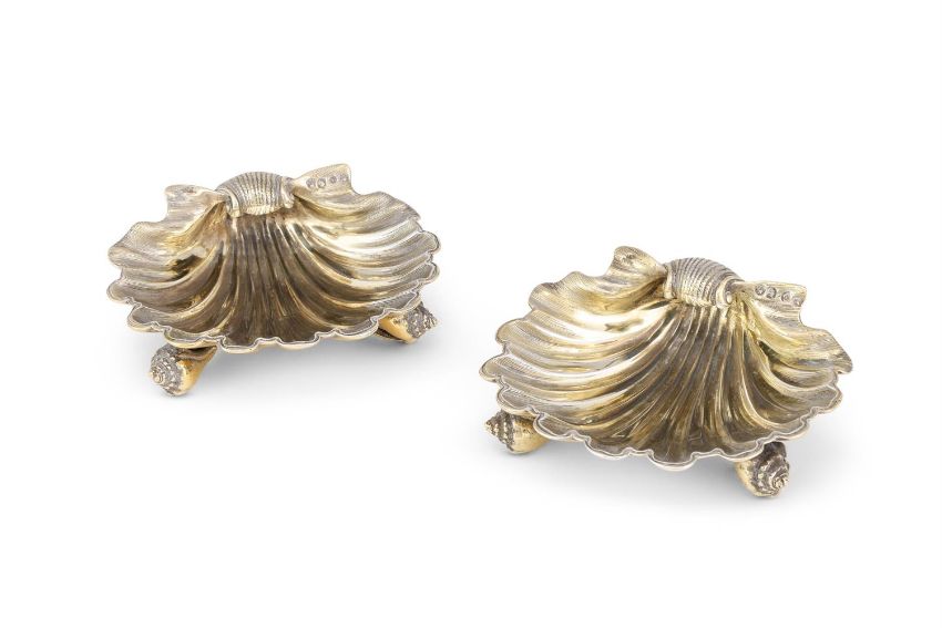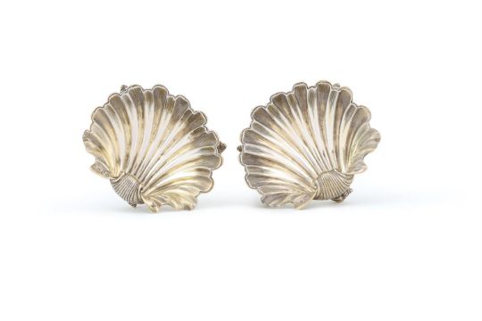 A PAIR OF VICTORIAN PARCEL SILVER-GILT SHELL SHAPED DISHES JOHN SAMUEL HUNT, LONDON 1843 Crisply modelled, each on three shell feet 11cm (4 1/2in) wide 334g (10.75 oz)   Condition Report: Marks are clearBoth stand wellNo engravingSome rubbing to the gilding Condition Report Disclaimer