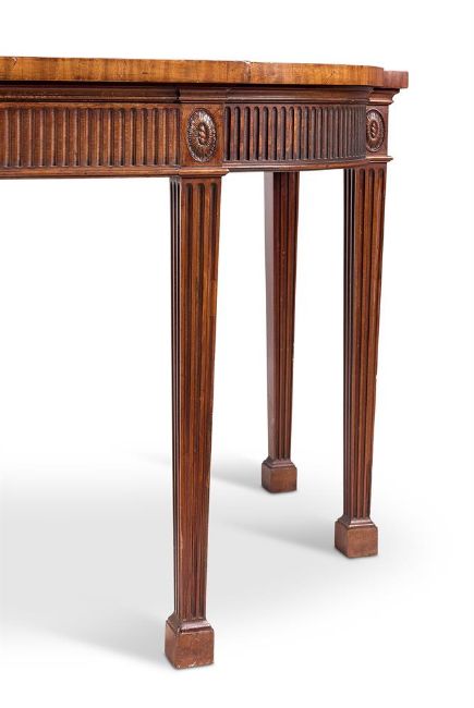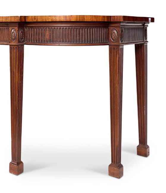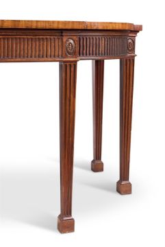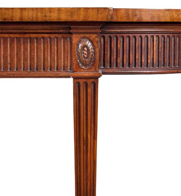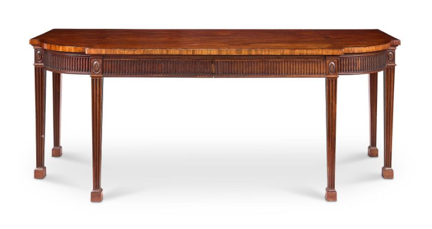 A GEORGE III MAHOGANY BREAKFRONT SERVING TABLE CIRCA 1780 Of D-shaped outline, the top banded and line-inlaid, formerly with a brass gallery, the fluted frieze with two mahogany-lined drawers between oval sunflower paterae, on fluted square tapering legs with block feet 86cm high, 230cm wide, 91cm Provenance: Claude. J. YorkeIllustrated: The Connoisseur, May 1965, p.3Literature: The Connoisseur, May 1965, p.4 Condition Report: Good, structurally secure with dents marks and scratches and shrinkage cracks due to age and use. The catalogue illustration is accurate. There are repairs to back edge of the top where the brass gallery was fitted. There is a 6.5 x 4cm patch to back right of top. Edge chips to the top, notably to front left of the break front. The drawers lined with green baize. Chips and minor repairs to the edges of legs, the block feet replaced.Condition Report Disclaimer
