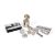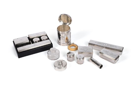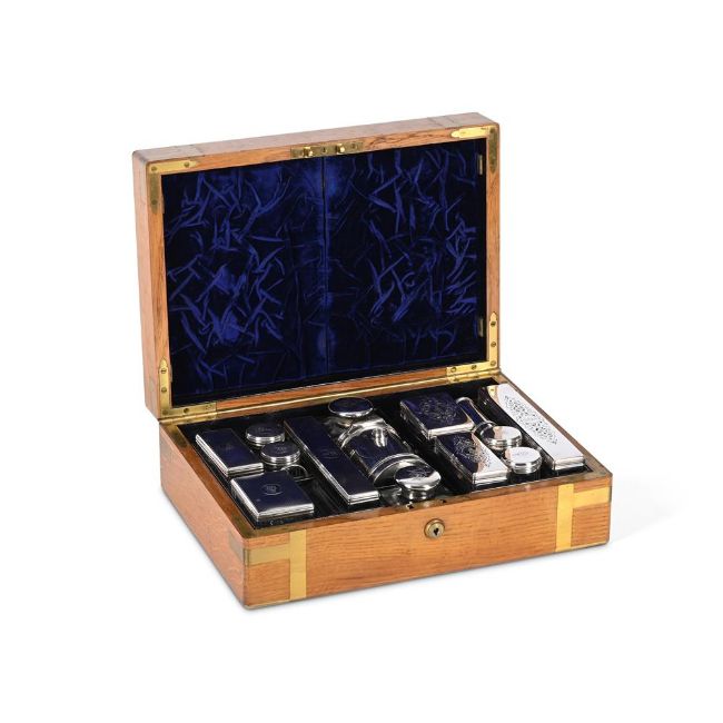 Y A VICTORIAN BRASS-BOUND OAK GENTLEMAN'S CAMPAIGN DRESSING TABLE BOX Opening to various silver mounted items, to include: a shaving pot with lampstand by Thomas Diller, London 1849, the cover with engine turned decoration and a screw on ivory loop handle; a shaving brush, maker's mark TW, London 1828, engraved with a monogram; five glass jars with silver covers by Brownett & Rose (Abraham Brownett & John Rose), London 1862, with engine turned decoration, engraved with a crest above a monogram within a circular reserve; five glass jars with silver covers, maker's mark AB, London 1863, with pierced and engraved scroll decoration, engraved with a crest above a monogram within a circular reserve; and three other jars The case 38 x28 x 13.5cm 737g (23.7 oz) gross weighable With a leather coverPlease note: Dreweatts have applied for a de minimis exemption for this lot. Ref: 1F3CQKX6