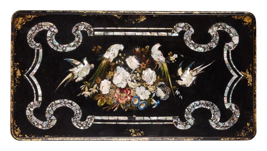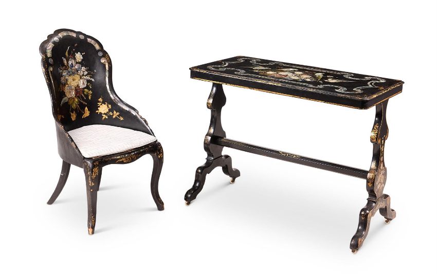 Y A VICTORIAN BLACK LACQUERED PAPIER-MACHE OCCASIONAL TABLE MID 19TH CENTURY The tip inlaid with mother-of-pearl and applied with parcel gilt decoration 73cm high, 97cm wide, 51cm deep Together with a Victorian inlaid black laquered papier mache occasional chair, in the manner of Jennens & Bettridge, circa 1840, with cane seat, on cabriole legs, 89cm high Condition Report: Various old repairs, including to where one leg of the chaor meets the rails, and where two legs of the table meet the upright.Various chips and losses to the top rail of the chair, see imagesLosses to painted surfaces, marks scratches and abrasions consistent with age and useCondition Report Disclaimer