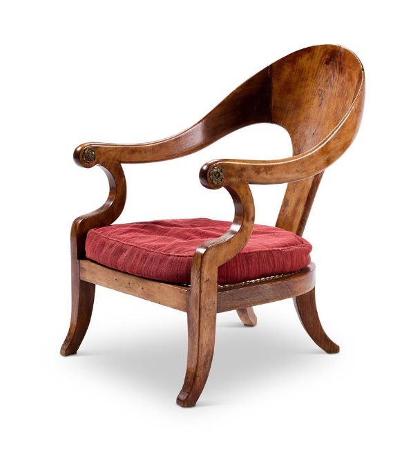 A BEECH AND GILT METAL MOUNTED ARMCHAIR FIRST HALF 19TH CENTURY With tub-shaped back leading to open arms above a caned seat and with removable squab cushion 80cm high Condition Report: Marks, knocks, scratches, abrasions consistent with age and use, some old splits and cracks, chips and losses, repair to the back where it meets an arm, the canework is later, there are further old plugged holes to the rails where other caning or upholstery has been placed previously. The squab cushion later Overall the frame is solid and stableThis may well have been previously ebonised or simulated rosewood to the surface. This has been scrubbed to reveal the beech below and this has then been polished as the surface. Gilt metal mounts with some dirt and discolourationPlease see additional images for visual referenced to condition Additional measurements:As catalogued this is 80cm high, the seat rail is 25cm high from the floor, with the seat cushion this is approximately 32cm high from the floor, the seat cushion is 50cm deep, 50cm wide, the arms are 54cm high from the floor at the frontsCondition Report Disclaimer