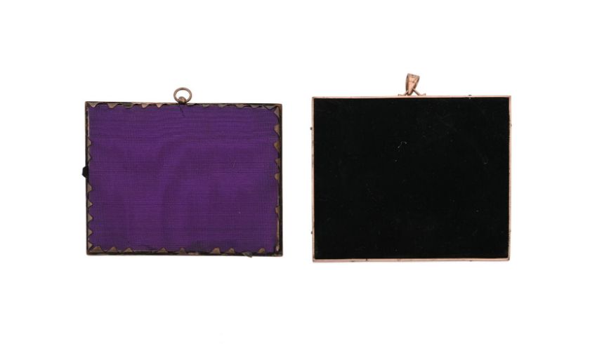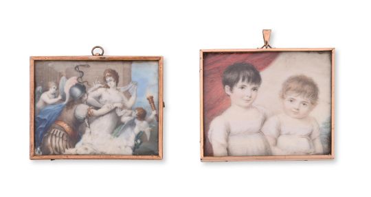 Y  EARLY 19TH CENTURY SCHOOL- A PORTRAIT MINIATURE OF TWO CHILDREN Of rectangular form, white vestments, red curtain and landscape beyond, in a later glazed gilt metal frame Watercolour on ivory image 6cm high, frame 6.5cm high AND AN EARLY 19TH CENTURY SCHOOL- A MINIATURE OF CLASSICAL SCENE Of rectangular form, cherub figures attending woman resisting the advances of a soldier, in a later glazed gilt metal frame Watercolour image 5.5cm high, frame 6cm high Please note: Dreweatts have applied for a de minimis exemption for this lot. Ref:JV9HRCNY Condition Report: With wear, marks, knocks and scratches as per age, handling, use, and cleaning. First- colours muted and bleached from sunlight, scattered spotting throughout painted surface Second- seems to be painted on surface, possibly artificial, and designed to look like ivory. colour muting, losses notably to lower corners, frame tired Please see additional images for visual references to condition which form part of this condition report. All lots are available for inspection and Condition Reports are available on request. However, all lots are of an age and type which means that they may not be in perfect condition and should be viewed by prospective bidders; please refer to Condition 6 of the Conditions of Business for Buyers. Condition Report Disclaimer