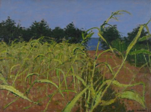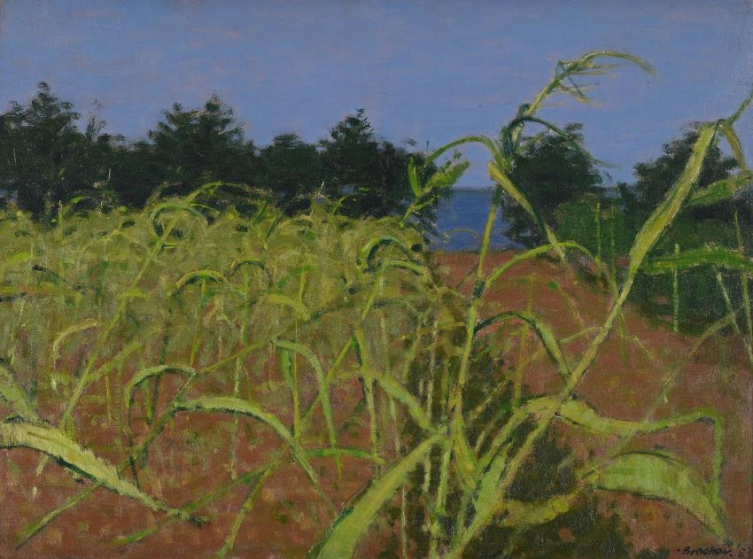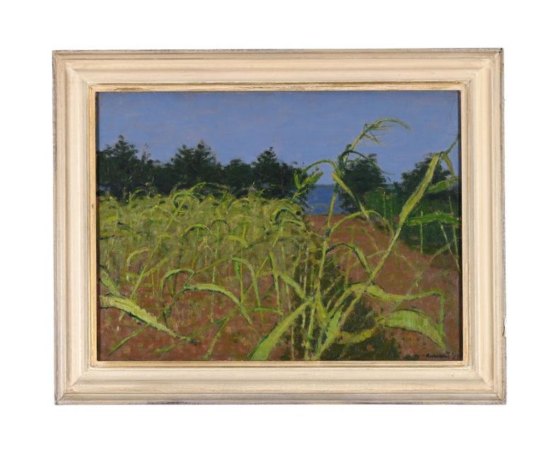 λ WILLIAM BROOKER (BRITISH 1918-1983) MAIZE FIELD, IBIZA Oil on canvas Signed and dated '53 (lower right); Inscribed, titled and dated 1953 to canvas overlap (verso) 46 x 61cm (18 x 24 in.)