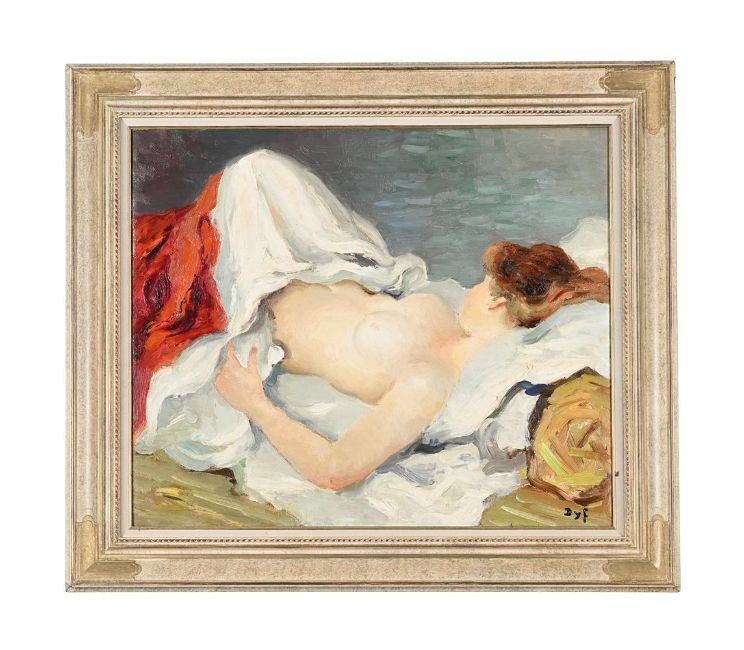 λ MARCEL DYF (FRENCH 1899-1985) NU ALLONGE Oil on canvas Signed (lower right) 54 x 65cm (21¼ x 25½ in.)Painted circa 1970. Provenance: Frost & Reed Gallery, London Sale, Lawrence's Auctioneers, Bletchingly, 3 February 2015, lot 1375 Private Collection, Hampshire (acquired from the above sale)We are grateful to Claudine Dyf for her assistance in cataloguing this work. The work will be included in the Marcel Dyf Archive. Condition Report: Relined. Light surface dirt throughout. Some yellowing varnish throughout. Some very fine craquelure to the thickest white pigment. Otherwise appears to be in original condition. Condition Report Disclaimer