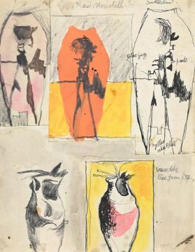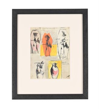 λ GRAHAM SUTHERLAND (BRITISH 1903-1980) STUDIES FOR 'RED MONOLITH' 1937 Ink, watercolour, gouache, pencil and collage Signed, titled Red monolith and dated 38 (to upper edge); further inscribed with colour notes (upper right); titled vase like tree form and dated 37/8 (lower right) 20.3 x 15.3cm (7 x 6 in.) There is a sketch executed in coloured crayons to the reverse of the sheet. Provenance: Private Collection, Herbert Spencer (a gift from the artist) Thence by descentLiterature:D. Cooper, The Work of Graham Sutherland, London, 1961, no.12b (illustrated)  Condition Report: The sheet is stuck down at the four corners. Surface dirt throughout. Condition Report Disclaimer