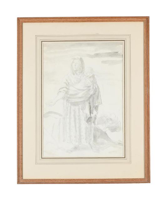λ AUGUSTUS JOHN (BRITISH 1878-1961) GYPSY MOTHER AND CHILD Pencil, ink and wash Signed and dated 1943 (lower right) 48.5 x 33.5cm (19 x 13 in.)Provenance: Private Collection, The Hon. Captain James Smith, London Private Collection, New York Macmillan & Perrin Gallery, Toronto (September 1981) Sale, John Goodwin Auctions, Malvern, sale date unknown Private Collection, Hampshire (acquired from the above)Exhibited: London, The Leicester Galleries, The Works of Augustus John, 1943, no. 46John made numerous studies of mothers with babies and children during the years before World War I and of Irish peasant families during his visit to Galway in 1915. It is most likely that this drawing dates from this period, but, as was often the case, was signed later for the 1943 Leicester Galleries exhibition. We are grateful to Rebecca John for her kind assistance in cataloguing this lot. Condition Report: Unexamined out of glazed frame. Some very light scattered marks of spotting around the edges, most notable to the left extreme edge. Slight undulation to the sheet. Condition Report Disclaimer
