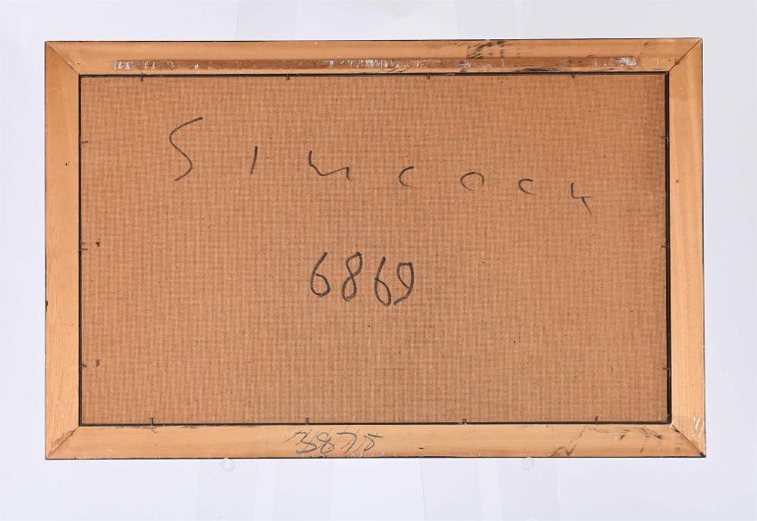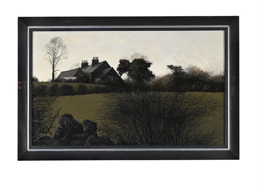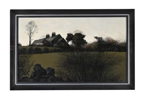 λ JACK SIMCOCK (BRITISH 1929-2012) HOUSE IN A LANDSCAPE Oil on board Signed and dated 69 (lower left); further signed (verso) 46 x 76cm (18 x 29¾ in.) Condition Report: Light surface dirt. Very light discolouration possibly caused by yellowing varnish most notable to the sky. Two light surface scratches each circa. 10cm, swooping through the sky to the upper left quadrant and through the chimney. Inspection under UV reveals no obvious evidence of restoration or repair. Condition Report Disclaimer
