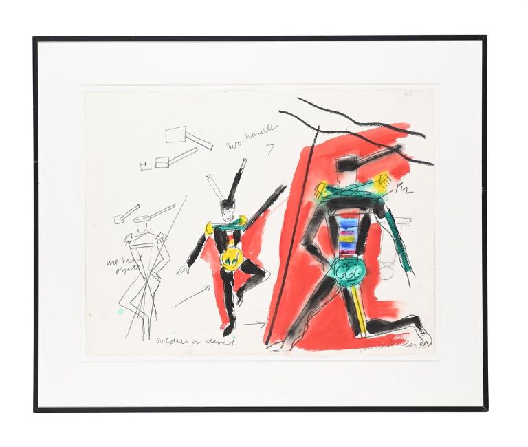 λ BRUCE MCLEAN (BRITISH B. 1944) STUDY FOR SOLDAT Gouache, watercolour and black crayon Signed and dated 85 (lower right); further inscribed with notes (across the sheet) 56.5 x 75.5cm (22 x 29½ in.)The present work illustrates costume studies for the ballet Soldat by Ashley Page for Ballet Rambert in 1989.