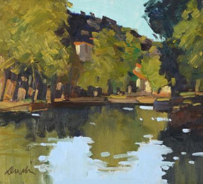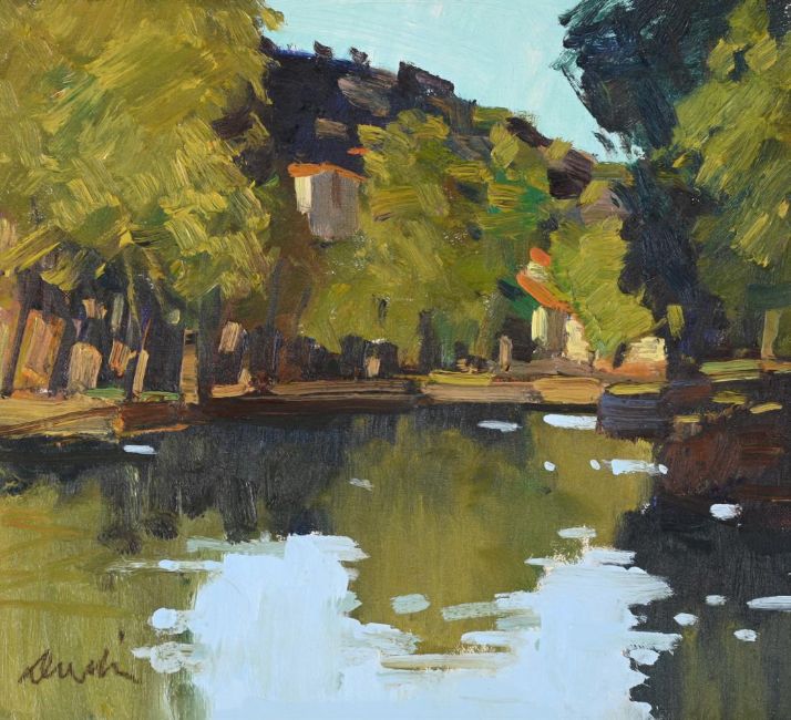 λ GEORGE DEVLIN (SCOTTISH 1937-2014) EVENING ON THE MARE, HERAULT Oil on canvas Signed (lower left) 33 x 35.5cm (12 x 13¾ in.)Provenance: Portland Gallery, London Exhibited: London, Portland Gallery, May, 1994 Condition Report: Unexamined out of glazed frame. Appears to be in good original condition. Condition Report Disclaimer