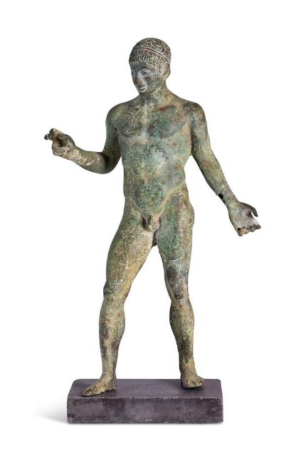 A BRONZE FIGURE OF A WARRIOR ANCIENT ROMAN STYLE, PROBABLY 20TH CENTURY Bronze with green encrusted verdigris patination, slate base 37.5cm high, base 15.2cm wide Condition Report: With deliberate "aged" surface and wear including hole to his left flank, left arm and handCondition Report Disclaimer