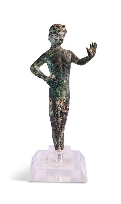 A BRONZE STANDING FIGURE OF PAN ANCIENT ROMAN, 1ST- 3RD CENTURIES Depicted horned, left hand held up, set on later Perspex base figure 13cm high, 14cm high overall Condition Report: Losses and wear to surface throughout, lacks feet and tail, traces of sea or water deposits With wear, marks, knocks and scratches as per age, handling, use, and cleaning. Purchased in a group lot a few years ago from a European auction house. Please see additional images for visual references to condition which form part of this condition report. All lots are available for inspection and Condition Reports are available on request. However, all lots are of an age and type which means that they may not be in perfect condition and should be viewed by prospective bidders; please refer to Condition 6 of the Conditions of Business for Buyers. This is particularly true for garden related items. All lots are offered for sale "as viewed" and subject to the applicable Conditions of Business for Buyer's condition, which are set out in the sale catalogue and are available on request. Condition Report Disclaimer