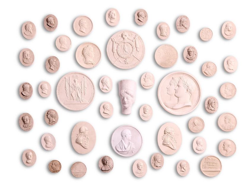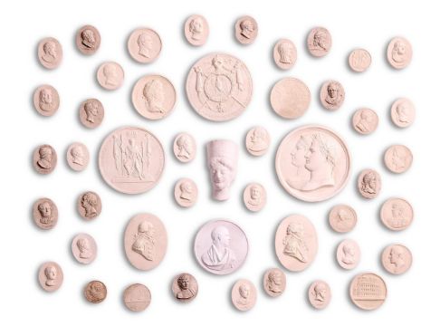 A COLLECTION OF PLASTER INTAGLIOS 19TH CENTURY, MOSTLY ENGLISH Assorted subjects cast after portraits, medals, antique and later cameos largest 14cm diameter