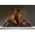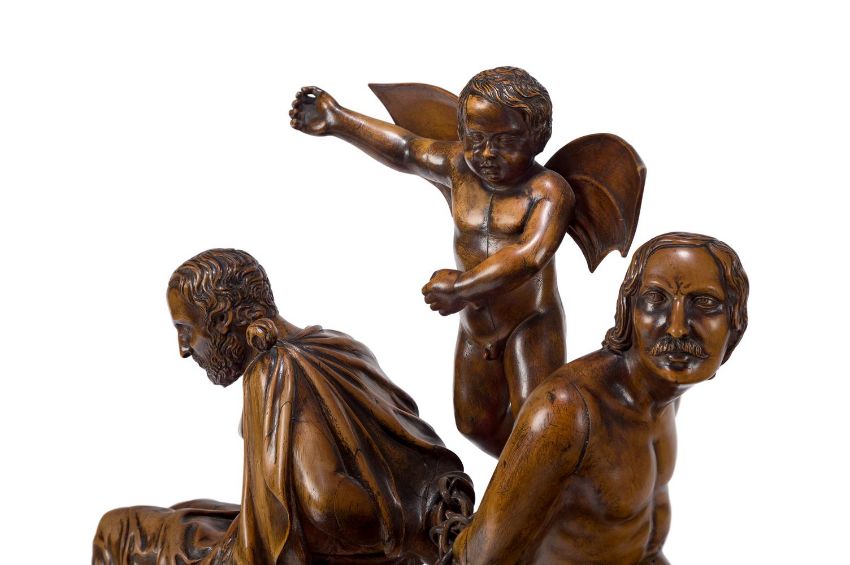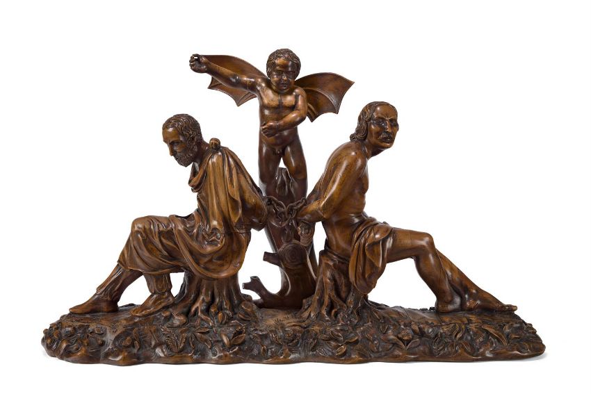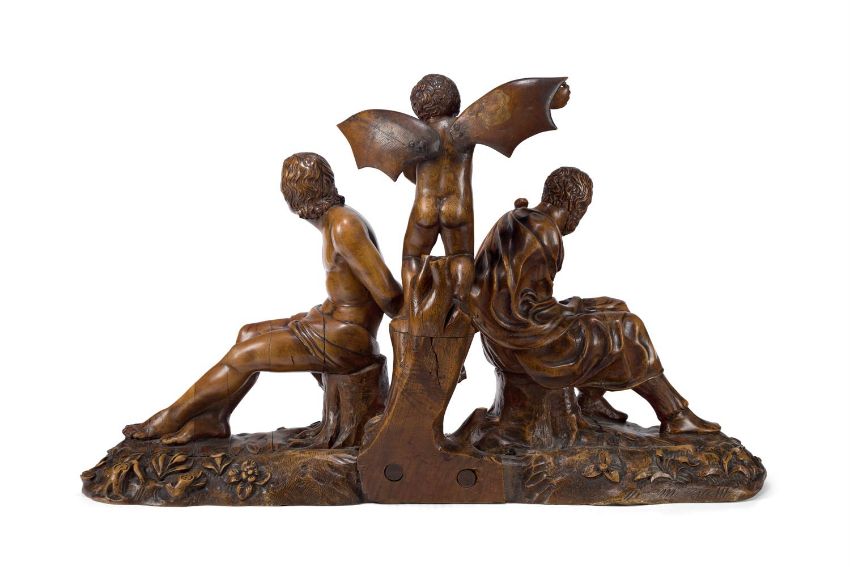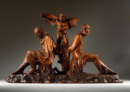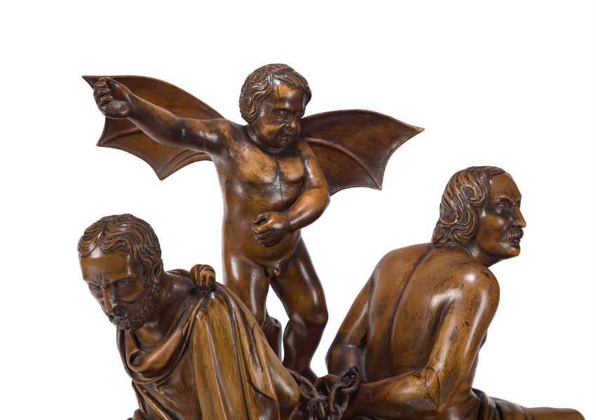A LARGE CARVED BOXWOOD ALLEGORICAL REPRESENTATION OF TWO CAPTIVES BOUND IN CHAINS GERMAN, 17TH/18TH CENTURY Winged child figure above the captives, naturalistic base 45.5cm high, base 73cm wide Unique in its iconography, this lively carved boxwood group presents two figures chained to a tree stump, with a winged putto looking over them. The bat-like shape of the latter's wings connotates him as an emissary of the devil, and - as the positioning of his hands and arms suggests - it is likely he originally held a spear or similar instrument to subjugate the captives. The beard and robes of the man on the left are reminiscent of ancient Roman representations of barbarians - most notably the white marble and porphyry pair from the second century AD now in the Louvre Museum, Paris (MR331 and MR332) - and thus single him out as a pagan, whereas the facial traits and prominent moustache of the man on the right conform to seventeenth-century representations of Ottoman subjects. The figures seated posesvare reminiscent of similar figures on ancient Roman sarcophagi and reliefs. Specific examples include a Roman 2nd century A.D. sarcophagus with the Triumph of Dionysus in the Fondazione Torlonia and a Roman frieze from the Temple of Sosiano in the collection of the Capitoline Museums at Centrale Montemartini in Rome. The choice of medium - boxwood - ties into an established Northern European tradition that flourished particularly across Germany and Flanders, and its stylistic traits bear similarities to the work of Leonhard Kern (1588-1662), whose workshop in Schwäbish Hall, in the Southern region of Baden-Württemberg, produced statuettes and small reliefs of high quality in boxwood, fruitwood, ivory, and alabaster. With CIRAM Radiocarbon Dating Report (0742-OA-1091R) July 2024.