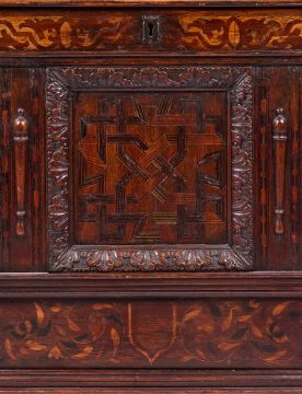 A CARVED OAK, FRUITWOOD AND MARQUETRY CHEST 17TH CENTURY With a hinged plank top above a strapwork-inlaid frieze rail and three panel front, the central panel with geometric inlay, the outer panels with arched frames and divided by uprights with split bobbin decoration, with a drawer below and stile feet 85cm high, 147cm, wide, 59cm deep Condition Report: Generally good and structurally secure, with dents marks and scratches consistent with age and use.Condition Report Disclaimer
