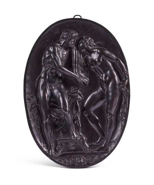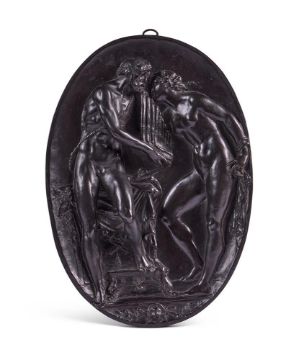 AFTER GIOVANNI BERNARDI- A BRONZE RELIEF PLAQUE DEPICTING PAN AND A FEMALE FIGURE ATTRIBUTED TO LODOVICO POGLIAGHI, EARLY 20TH CENTURY The female figure either Syrinx or Venus, possible faint incised initials lower right 44cm high, 31cm wide For further information with regards two similar plaques by Giovanni Bernardi, please see Medieval & Renaissance Sculpture in the Ashmolean Museum by Jeremy Warren, Volume 3, Plaquettes, Nos. 258 & 259. Condition Report: Generally good condition- mild edge wearCondition Report Disclaimer