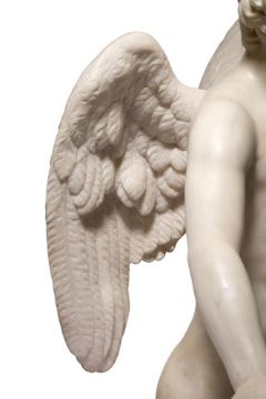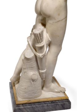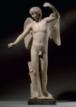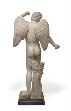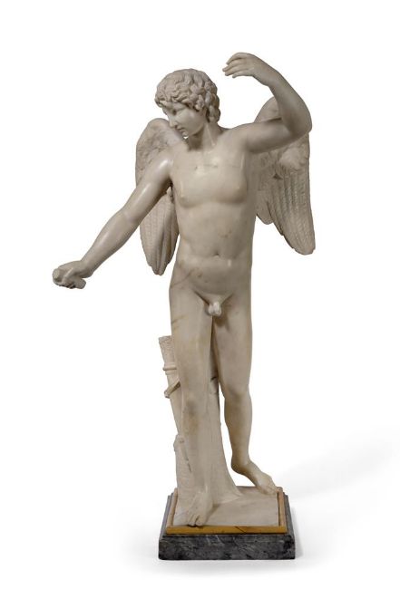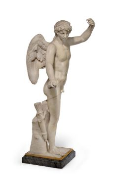 A WHITE MARBLE FIGURE OF EROS ITALIAN, 18TH CENTURY Set on a Giallo marble mounted grey marble base 84cm high, base 23cm wide Condition Report: With wear, marks, knocks and scratches as per age, handling, use, and cleaning. Natural veining and inclusions- some remedial repairs to fingers of left hand, right wrist and slight fluorescence under chin and along legs under UV Approx 30KG Please see additional images for visual references to condition which form part of this condition report. All lots are available for inspection and Condition Reports are available on request. However, all lots are of an age and type which means that they may not be in perfect condition and should be viewed by prospective bidders; please refer to Condition 6 of the Conditions of Business for Buyers. This is particularly true for garden related items. All lots are offered for sale "as viewed" and subject to the applicable Conditions of Business for Buyer's condition, which are set out in the sale catalogue and are available on requestCondition Report Disclaimer