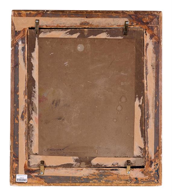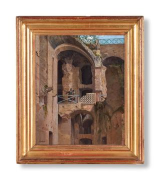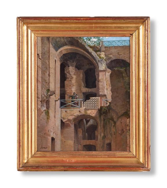 GILLES- FRANÇOIS-JOSEPH CLOSSON (BELGIAN 1796-1842) ROME, WITH A VIEW OF THE PONTE DI CALIGOLA, IN THE IMPERIAL PALACES, PALATINE HILL Oil on board Indistinctly signed (lower left); inscribed 'G.F. CLOSSON / Visite a Colysee / 1829' (verso) 61.5 x 53cm (24 x 20¾ in.) Condition Report: Light surface dirt throughout. Some isolated patches of craquelure. The varnish is slightly uneven, which has caused some discoloration, particularity to the walls. There is some undulation to the board. Inspection under UV reveals scattered retouching throughout. Condition Report Disclaimer