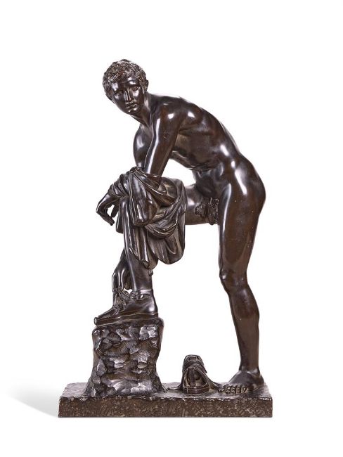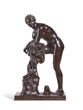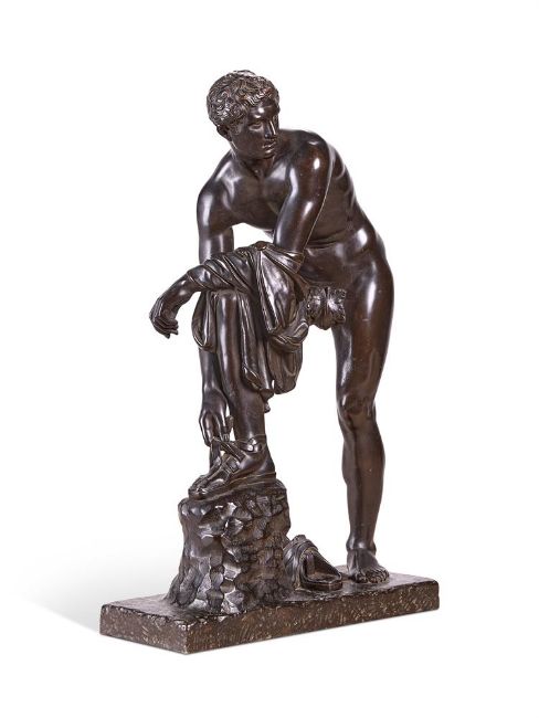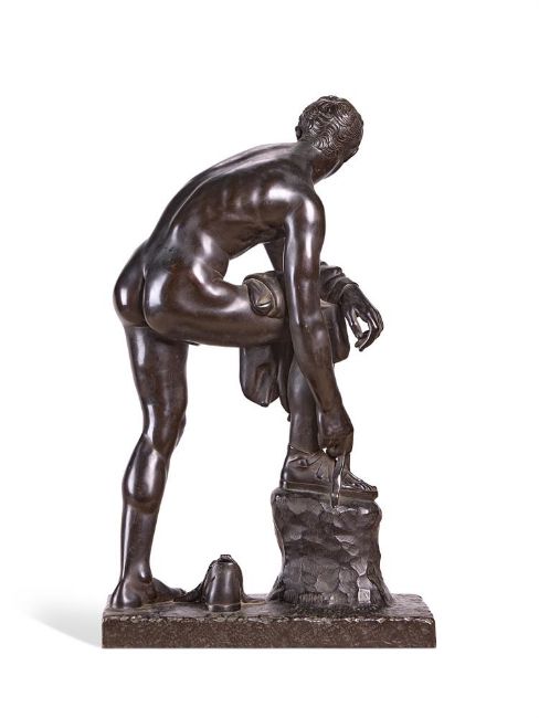 A LARGE BRONZE FIGURE OF HERMES FASTENING HIS SANDAL, ALSO KNOWN AS CINCINNATUS ITALIAN, 19TH CENTURY 63cm high, base 38 by 17cm After a Roman marble copy of an original Greek Bronze by Lysippus, now held in the Musée du Louvre in Paris. For a similar example of the same scale- please see Dreweatts 1759, Fine Furniture and Works of Art, 10th September 2024, lot 278 (sold £3,800 hammer price). Condition Report: With mild wear, marks, knocks and scratches as per age, handling, use, and cleaning. Some engrained dirt around recesses- slight wear to patina of raised areas of anatomy, a few scattered small paint spots, small scuffs to left side of his mid back Please see additional images for visual references to condition which form part of this condition report. All lots are available for inspection and Condition Reports are available on request. However, all lots are of an age and type which means that they may not be in perfect condition and should be viewed by prospective bidders; please refer to Condition 6 of the Conditions of Business for Buyers. This is particularly true for garden related items. All lots are offered for sale "as viewed" and subject to the applicable Conditions of Business for Buyer's condition, which are set out in the sale catalogue and are available on request. Condition Report Disclaimer