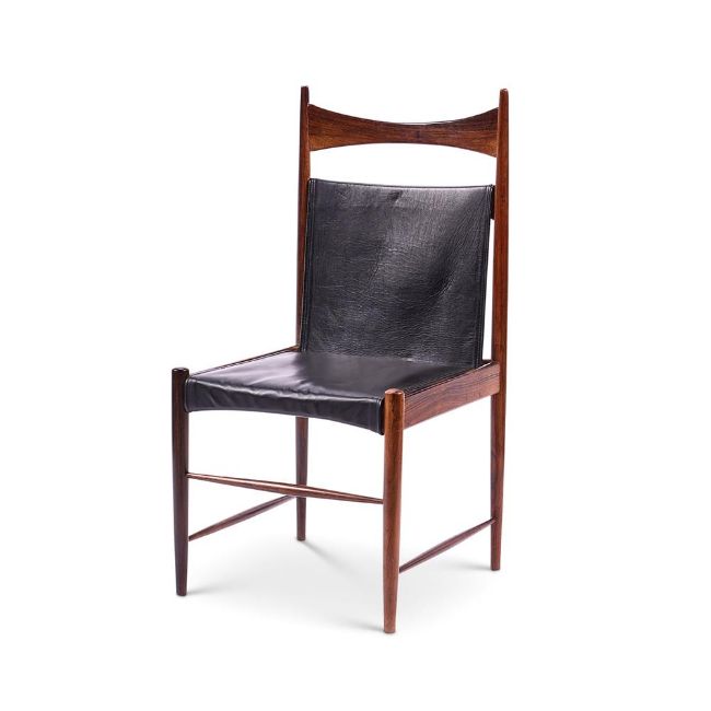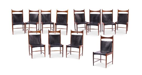 Y  A SET OF TWELVE BRAZILIAN JACARANDA 'CANTU' HIGH BACK DINING CHAIRS BY SERGIO RODRIGUES (1927 - 2014), DESIGNED IN 1958 Upholstered in black leather 101cm high, 50cm wide, 52cm deep Article 10 certificate has been obtained for this lot (Certificate No 24GBA10ADUJ21) Condition Report: Generally good, structurally secure with the inevitable minor dents marks and scratches and shrinkage cracks due to age and use. Condition Report Disclaimer