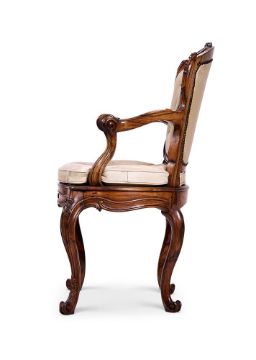 A PAIR OF INDO-PORTUGUESE COROMANDEL FAUTEUILS 19TH CENTURY Each with a shell-carved and padded cartouche shaped back, scrolled arms and a caned serpentine seat with squab cushion, on cabriole legs, upholstered in cream leather, pegged construction 60 cm wide,100cm high, 48cm deep Condition Report: Good condition, structurally secure with minor general wear and tear. There are the inevitable minor dents marks and scratches and shrinkage cracks due to age and use. The upholstery in good condition, the leather a bit worn. One caned seat sagging a little, the other good.Condition Report Disclaimer